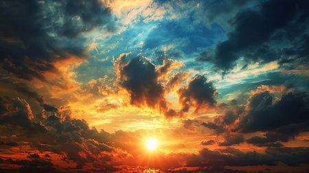 A breathtaking view of a sunset with vibrant colors and dramatic cloud formations. The golden sunlight illuminates the scene.