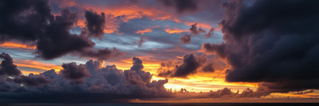 Dramatic storm clouds lit in vivid orange and yellow colors at sunset. A panoramic shot of a weather phenomenon.