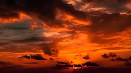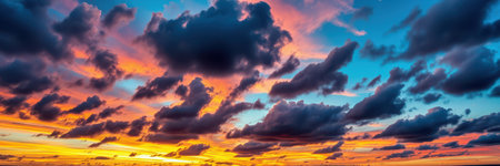 Panorama photo of dramatic sky with orange sunset and clouds