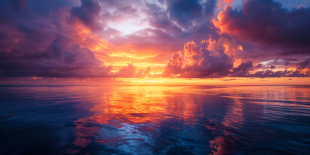 Experience the beauty of a vibrant sunset casting a warm glow over tranquil ocean waves. This colorful scene features a sky full of stunning clouds.