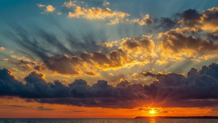 Sunset over the sea with dramatic cloudscape and sunbeams