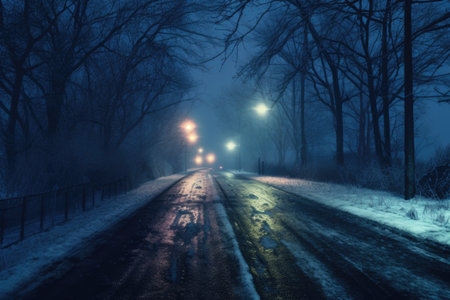 A freezing snowy road at midnight with a street light illuminating the dark landscape, creating a mesmerizing geological phenomenon in the sky