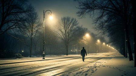 A blurry winter night scene on an urban street with falling snow and soft, glowing orange streetlights creating a...