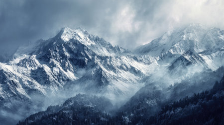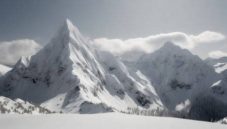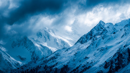 Majestic snow-covered mountains under a cloudy sky in winter landscape