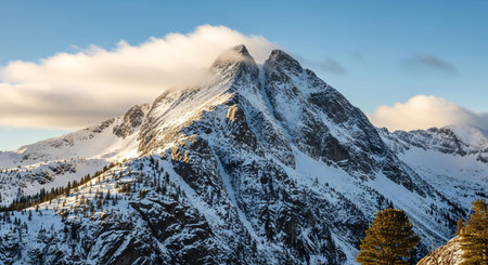Snow blankets the rugged peak as clouds drift around, showing the beauty of winter in the mountains.