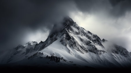 Beautiful alpine mountain landscape with snow covered peaks in the clouds