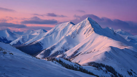 Soft pastel light enhances the snowy mountain contours, captured with exceptional sharpness for a premium winter visual.