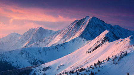 Beautiful mountain landscape with snow-capped peaks at sunset.