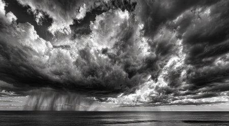 A dramatic monochrome image displays heavy storm clouds releasing rain over a body of water. The high contrast image features textured clouds and a reflective surface. The composition conveys a sense of impending weather change and could be used for various editorial or design projects.