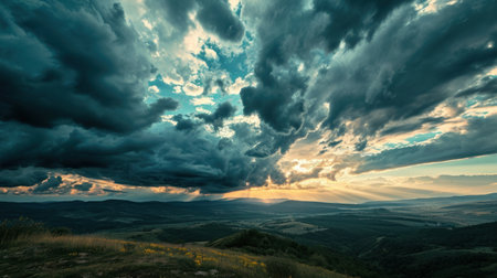 A striking landscape photograph featuring dark storm clouds with sunlight piercing through, casting light beams over a lush green field, creating a dramatic and awe-inspiring natural scene at a distant horizon. AI generated image