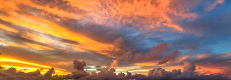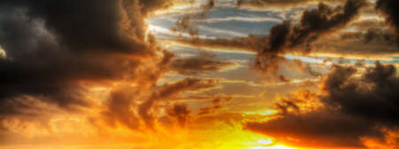 Dramatic panorama of the sunset sky with clouds in the evening.