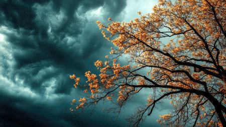 A striking image of autumn leaves showcasing vibrant orange hues against a backdrop of dark and dramatic storm clouds, capturing the essence of seasonal change and nature's beauty.