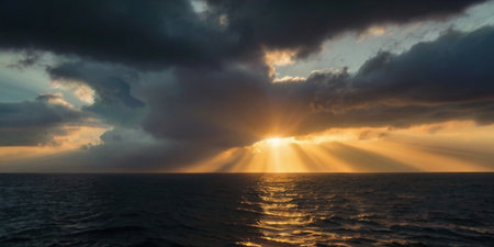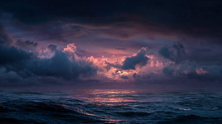 A captivating seascape captures a dark ocean under a moody sky, with soft light illuminating the water's surface and creating a serene atmosphere.