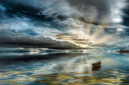 silhouette of a man in a boat floating on the sea Rich dark clouds blue tint