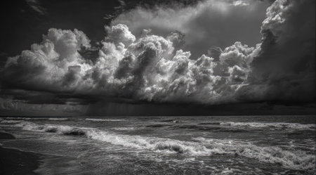 A black and white photograph presents an ocean scene dominated by towering clouds above the water. The dramatic composition features crashing waves and the interplay of light and shadow across the sea and sky. This image could be suitable for a variety of uses, including artistic prints or editorial illustrations.