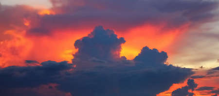 Dramatic sky at sunset or sunrise with red and orange clouds. Variegated colored clouds at the evening sunset of the summer sky.