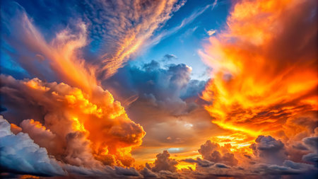 Golden hour paints a dramatic cloudscape with vibrant hues, creating a breathtaking display of natures artistry as the sun dips below the horizon