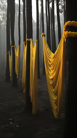 Golden Fabrics Hanging Forest Trees Nature Scene Artistic Photography fold dark mood view life rich