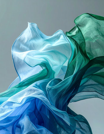 A delicate, sheer fabric in shades of blue, green, and turquoise billows gracefully against a neutral background. The fluid, wave-like motion creates an ethereal and serene abstract form, suggesting the gentle flow of water or a soft breeze. This image evokes a sense of calm, elegance, and pure, weightless freedom.