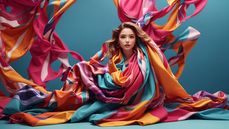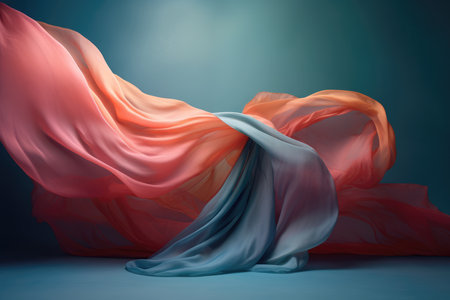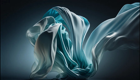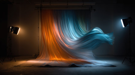 A captivating image of fabric flowing gracefully in a studio setting, illuminated by dramatic lighting. This dynamic composition showcases the beauty and elegance of motion in design.