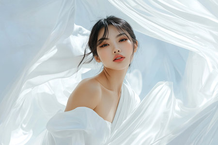 Asian girl white dress stand against white wall of fluttering fabric and silk. Fashion photo. High quality photo