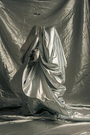 This captivating monochrome image presents a mysterious figure enveloped by flowing fabric, creating an ethereal atmosphere in a contemporary art style.