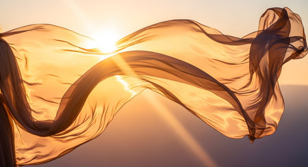 A piece of elegant golden fabric billows gracefully in the wind against a bright sunset sky. The sheer material captures the sunlight, creating a glowing, ethereal effect with soft folds and curves. The image conveys themes of freedom, lightness, and dramatic beauty.