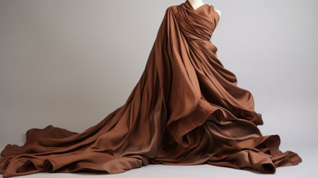 mannequin adorned with a long flowing dress from lilia alvarado's deconstructed tailoring collection in brown and bronze. the draperies are made of luxurious fabrics captured in irving penn's sheet film style. ai generated