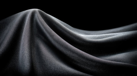 This stunning image captures an elegant black fabric draped in intricate folds, showcasing smooth textures and dramatic highlights, ideal for artistic projects.