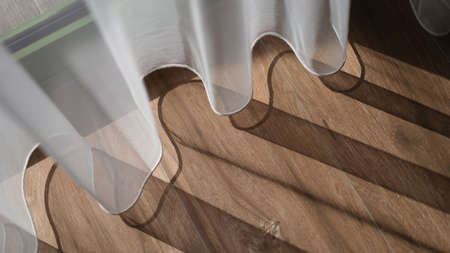 A fragment of a linen curtain close-up. Shadow from the curtains on the floor.