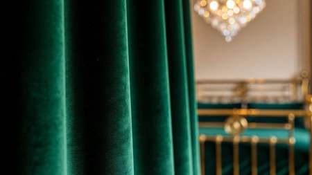 Green velvet curtain in a luxury hotel room. Selective focus.