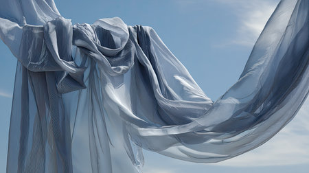 A captivating image featuring soft, flowing textiles suspended against a clear blue sky. This serene composition captures the beauty of fabric's movement, ideal for creative projects in fashion and interior design.
