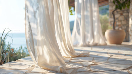 Light and airy curtains gently swaying in the wind on a sunsoaked stone terrace