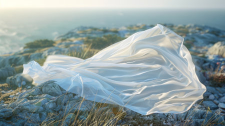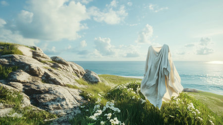 a white fabric flows in the wind on a grassy hill overlooking a blue ocean under a partly cloudy sky