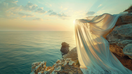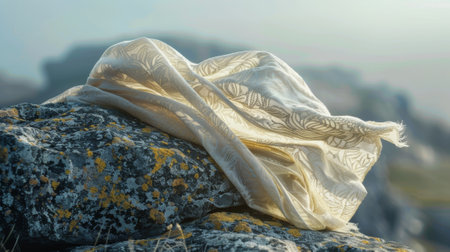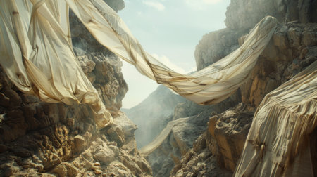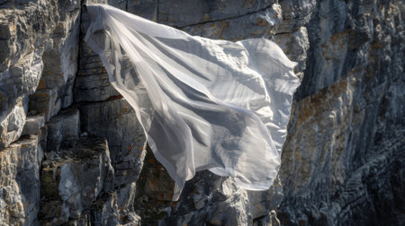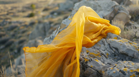 A gauzy yellow scarf dd over a rocky cliff fluttering in the wind and adding a touch of playfulness to a rugged landscape