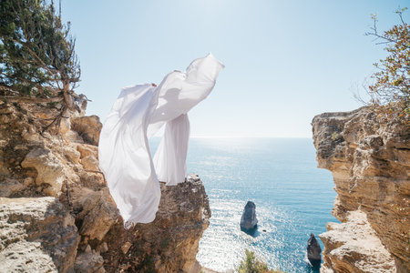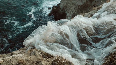 The cliffside becomes a stage for the dramatic performance of flowing fabric evoking emotions of both awe and tranquility