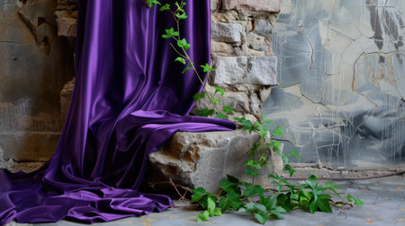 A stunning display of rich purple fabric cascading gracefully over a weathered stone wall, enhanced by trailing green ivy leaves that bring life and elegance to the scene.
