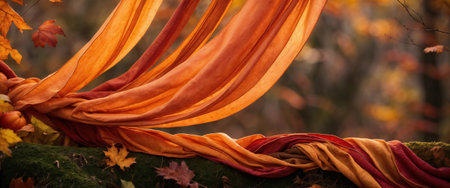Orange fabric gently waving in the wind with a blurred autumn background providing copy space for fall themed advertising