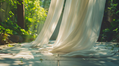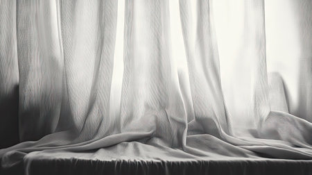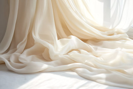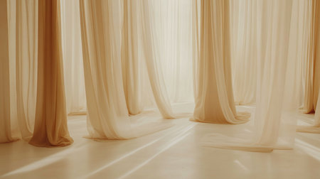 Ethereal light filters through sheer fabric, creating a warm and tranquil atmosphere. Perfect for adding elegance and a soft touch to interior spaces.