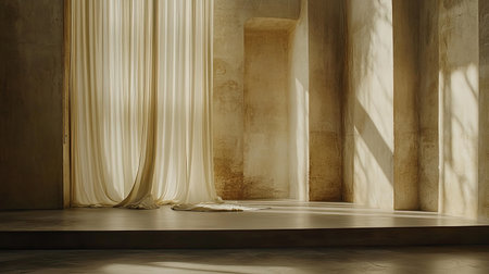 A minimalist podium with soft, flowing curtains in shades of beige and cream. The background is a clean white floor, creating an elegant backdrop for product display or presentation. Soft lighting creates gentle shadows on the surface, enhancing its ethereal quality. --chaos 30 --ar 16:9 --v 6.1 Job ID: ad2f7da7-bc65-45fd-84cb-7a3b13243258