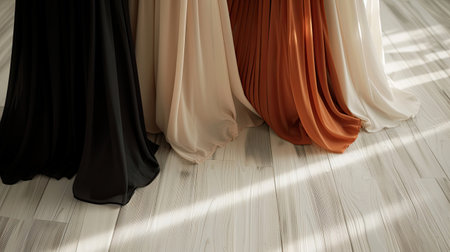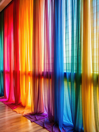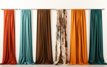 A collection of curtains drapes gracefully, showcasing a blend of rich colors and textures. The fabric panels catch soft daylight, enhancing the room's inviting atmosphere. Generative AI.