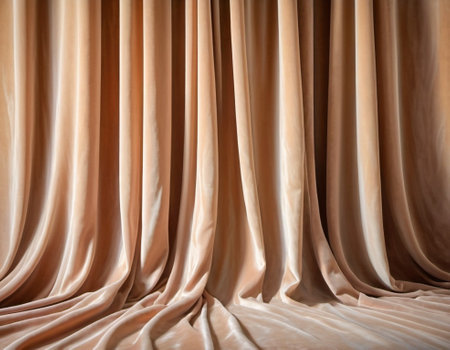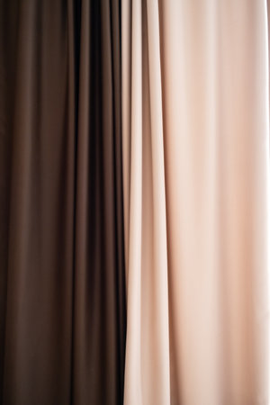 Curtain with soft smooth flowing folds. Deep beige color and luxurious texture create a dramatic and elegant atmosphere. Decoration and interior design. Expensive curtain made of rich fabric. AI.