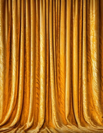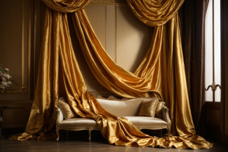 Curtain with soft smooth flowing folds. Deep golden color and luxurious texture create a dramatic and elegant atmosphere. Decoration and interior design. Expensive curtain made of rich fabric. AI.