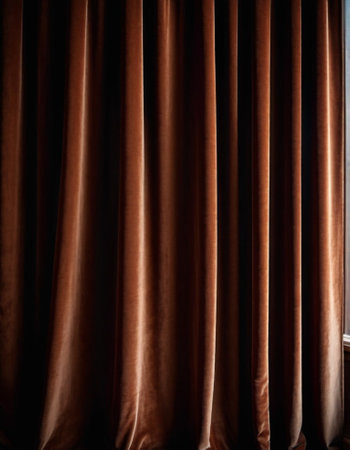 Curtain with soft smooth flowing folds. Deep brown color and luxurious texture create a dramatic and elegant atmosphere. Decoration and interior design. Expensive curtain made of rich fabric. AI.