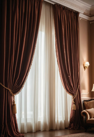 Rich, expensive silk curtains in deep brown frame a bright, airy window, enhancing the elegance of a well-appointed living area with tasteful decor and soft lighting.