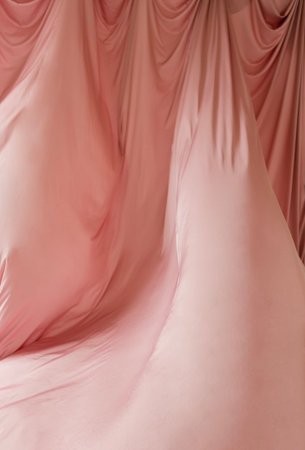 Elegant pink fabric drapes gracefully, forming soft folds and textures, perfect for artistic backgrounds, photography, or design projects showcasing delicate aesthetics