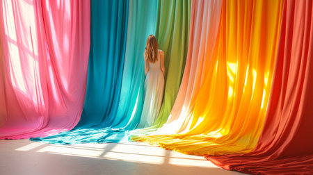 A serene scene of a woman in a white dress standing amidst vibrant draped fabrics in soft light, creating an artistic and dreamy atmosphere.