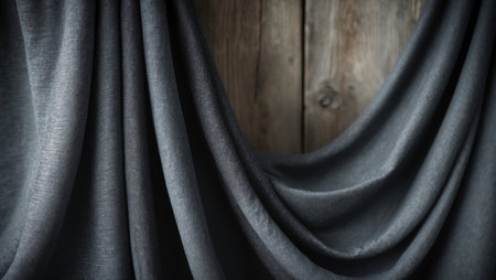 AI Generated. Draped Dark Gray Fabric on Wooden Background Elegant Textile Texture