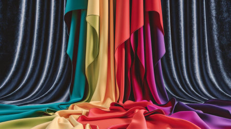 Multi-colored wavy fabric. Abstract curtains hanging on the floor. AI generated.