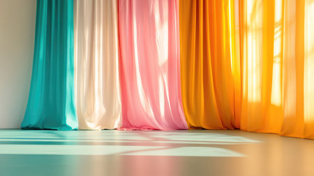 This image showcases soft fabric drapes in vibrant hues of teal, pink, and yellow, creating a serene and inviting atmosphere in a brightly lit space.